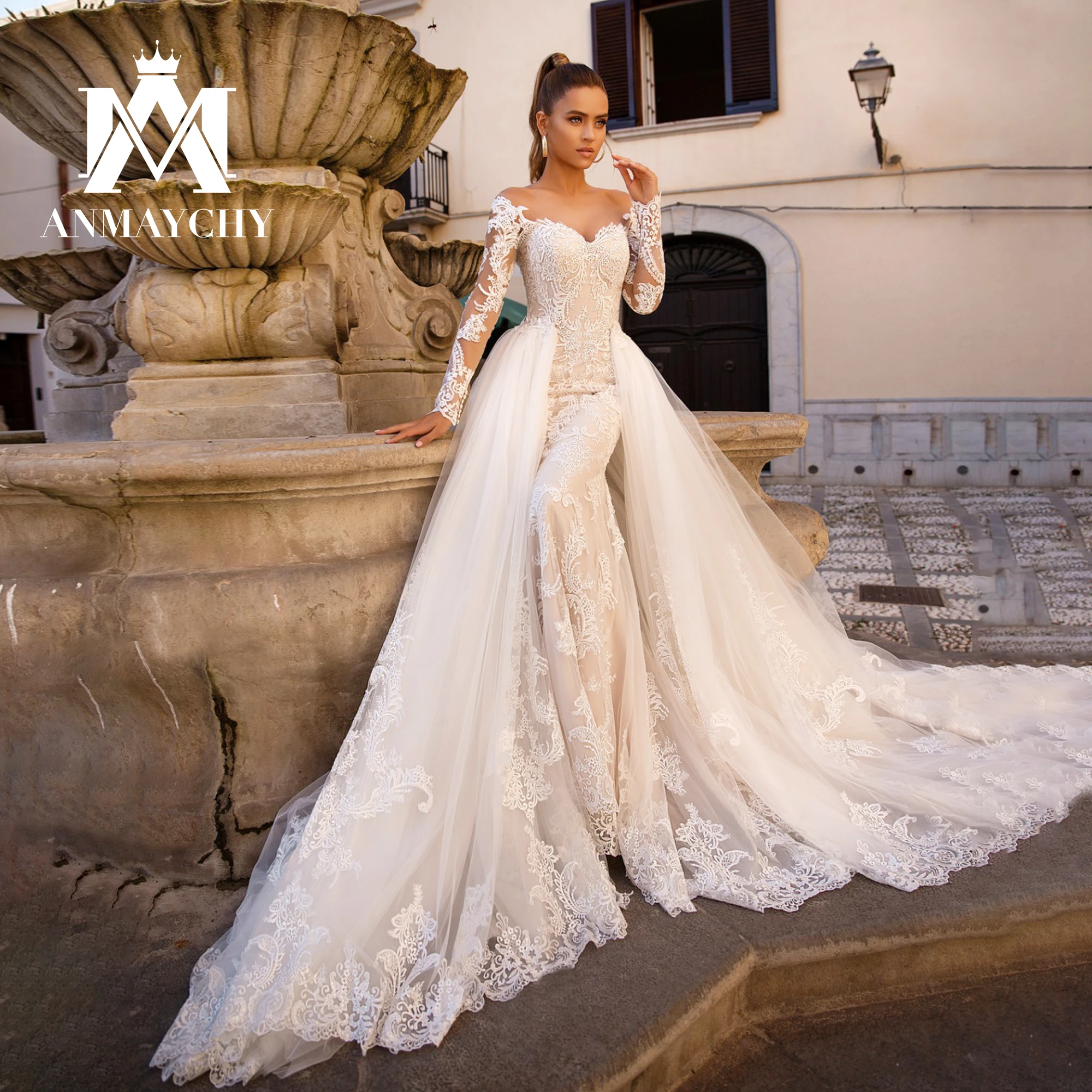 Anmaychy 2 In 1 Mermaid Wedding Dresses 2022 Modern Long Sleeve Detachable Train Off The Shoulder Appliques Button Wedding Gown Wedding Dresses Aliexpress
